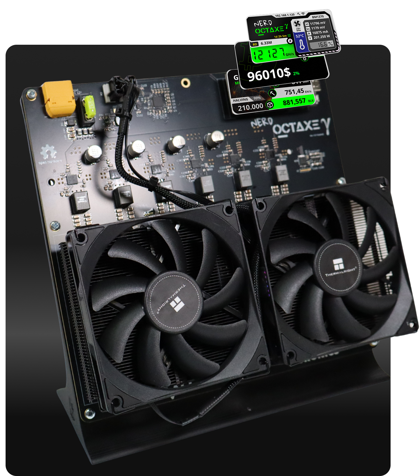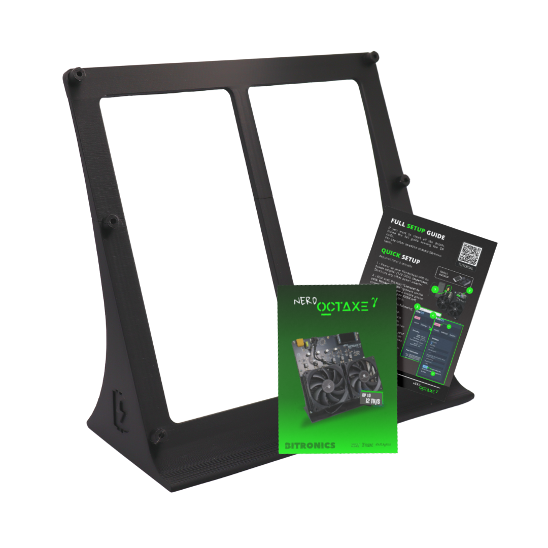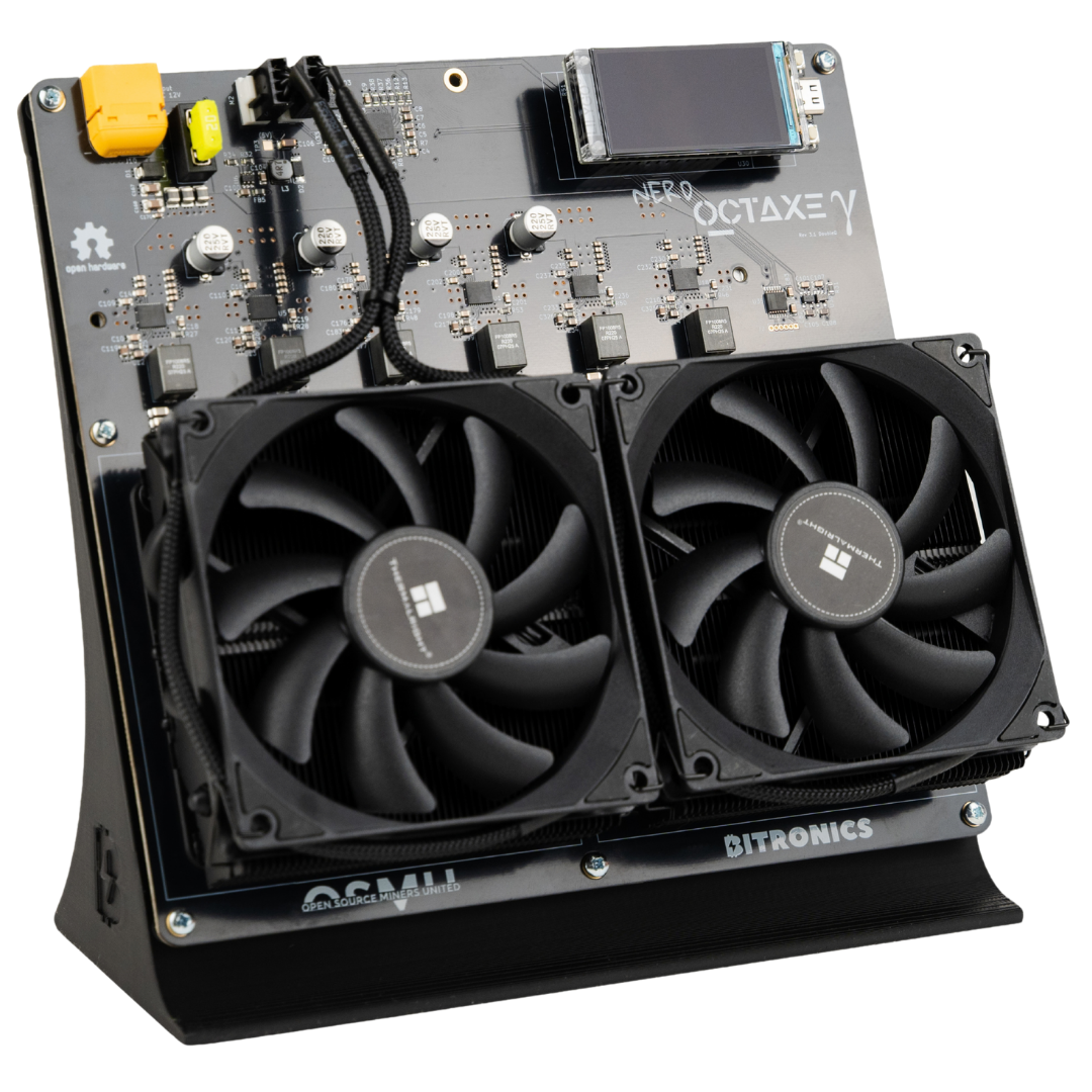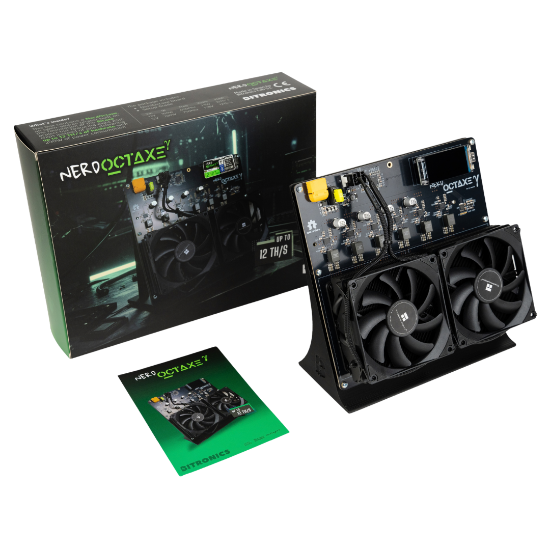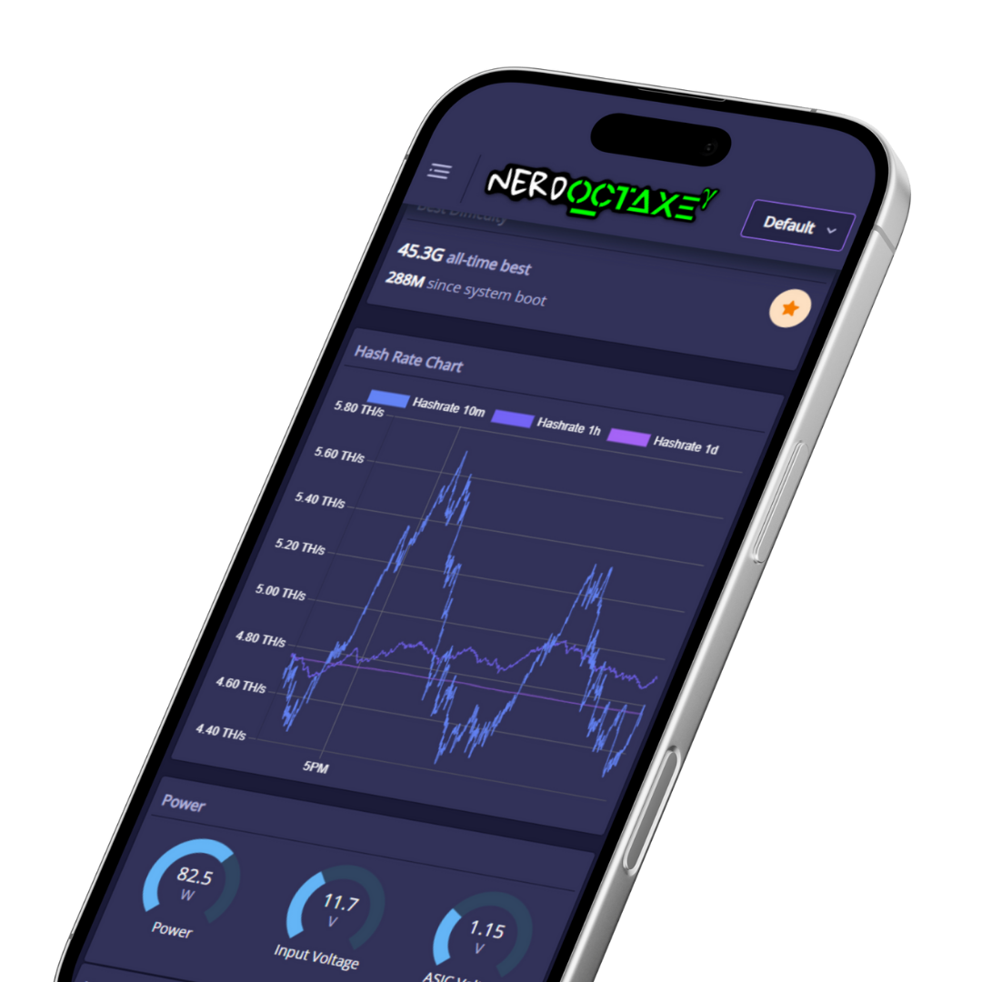 The NerdOctaxe brings powerful open-source mining into a compact, elegant form factor, delivering up to 12 TH/s of hashrate in its latest Revision 3.1. With its signature full-color LilyGo T-Display S3 interface and a clean, responsive UI, the NerdOctaxe gives you instant access to hashrate, ASIC temperatures, power consumption and real-time miner status.