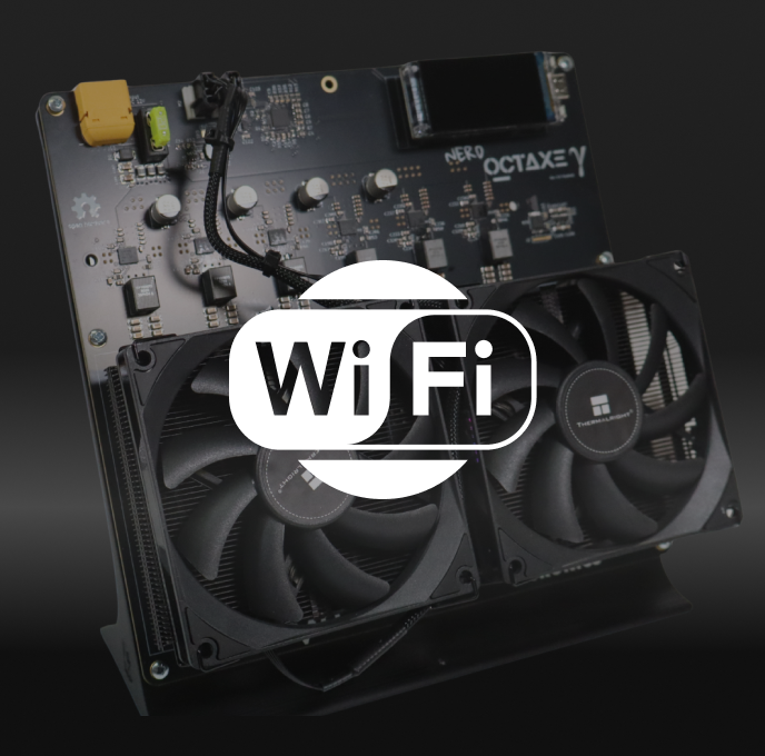 Setting up the NerdOctaxe is fast and simple. Connect a 12V 20A PSU through its upgraded XT60 high-current connector and the miner will automatically create a Wi-Fi network. From there, access the web portal to configure Wi-Fi, mining pool settings and your Bitcoin address in just minutes.